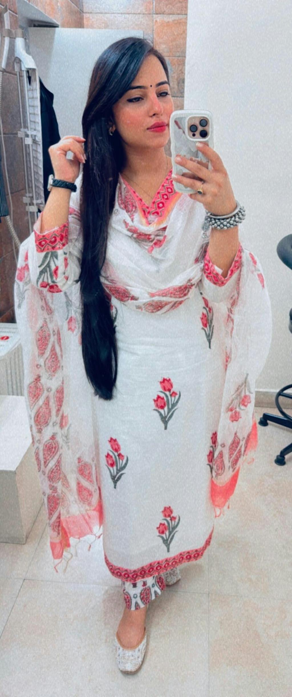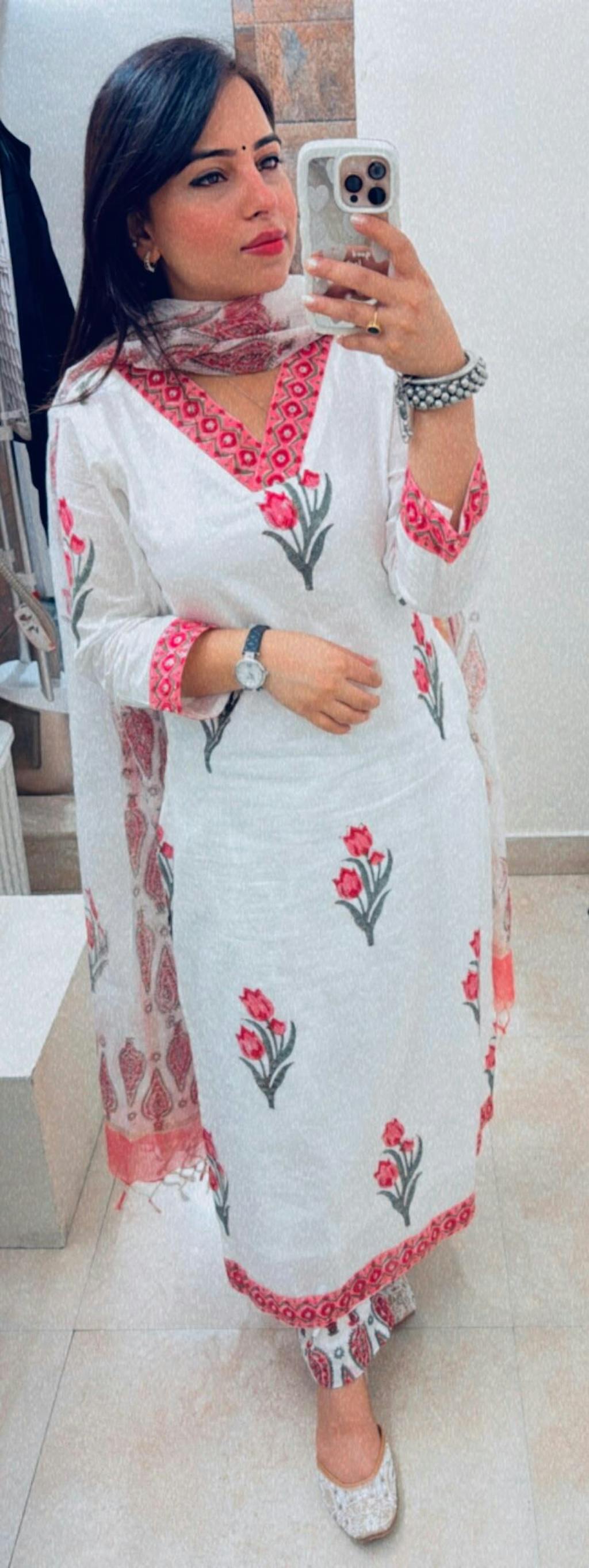 Celebrate your style with this Chanderi Suit Set with Floral Hand Block Printing by the artisans. Its unique combination of traditional craftsmanship and contemporary design will make you stand out at any event, whether it's a wedding, festive celebration, or a special evening out. Embrace the beauty of Indian heritage in this extraordinary ensemble, and radiate timeless charm.Paired with cotton pants and chanderi dupatta, this outifit is surely a head turner.