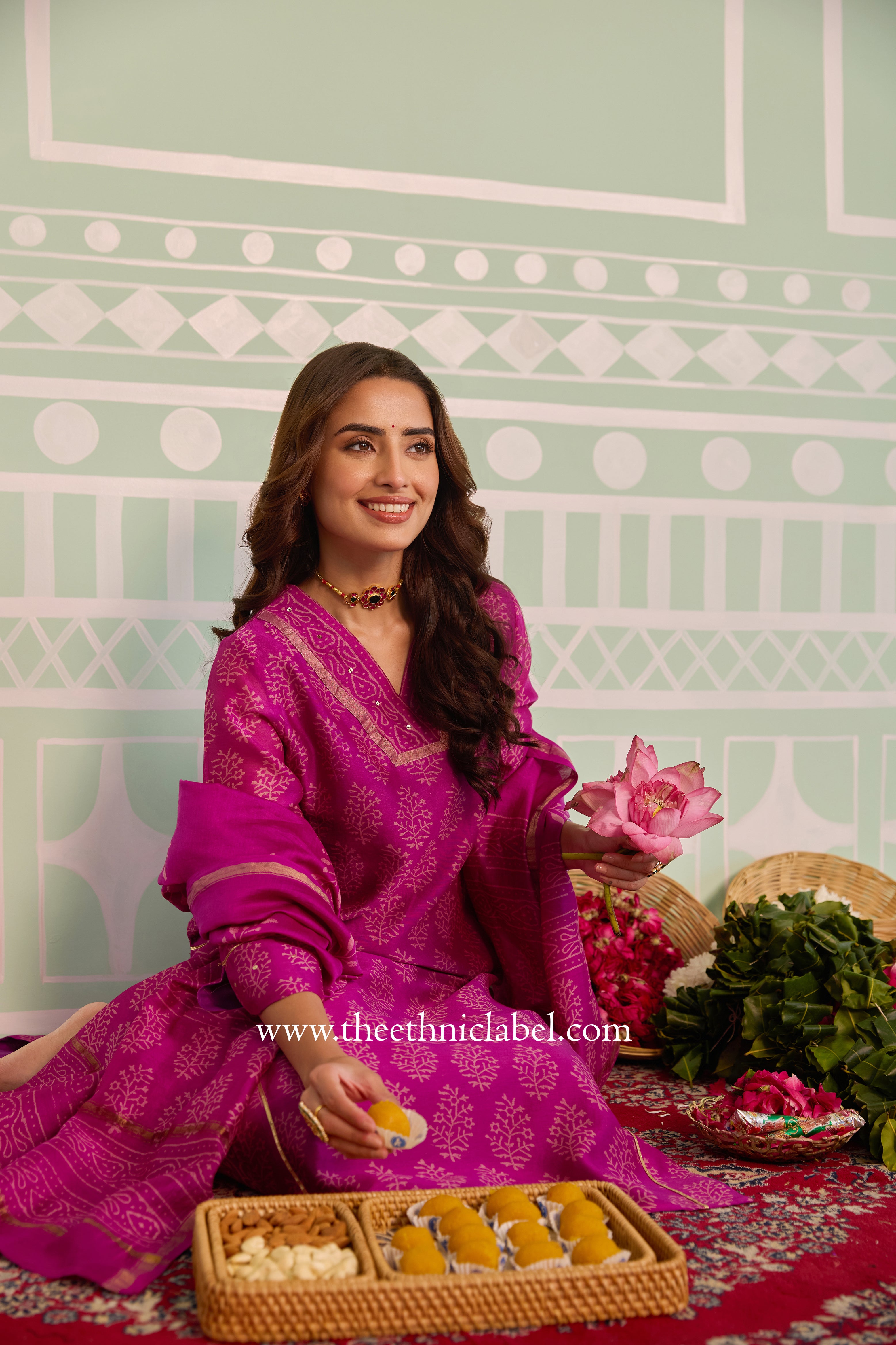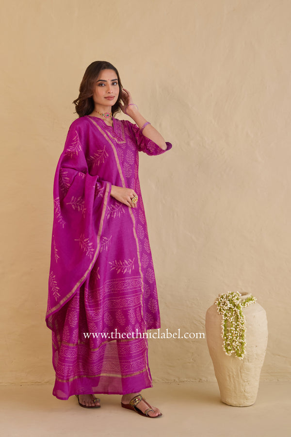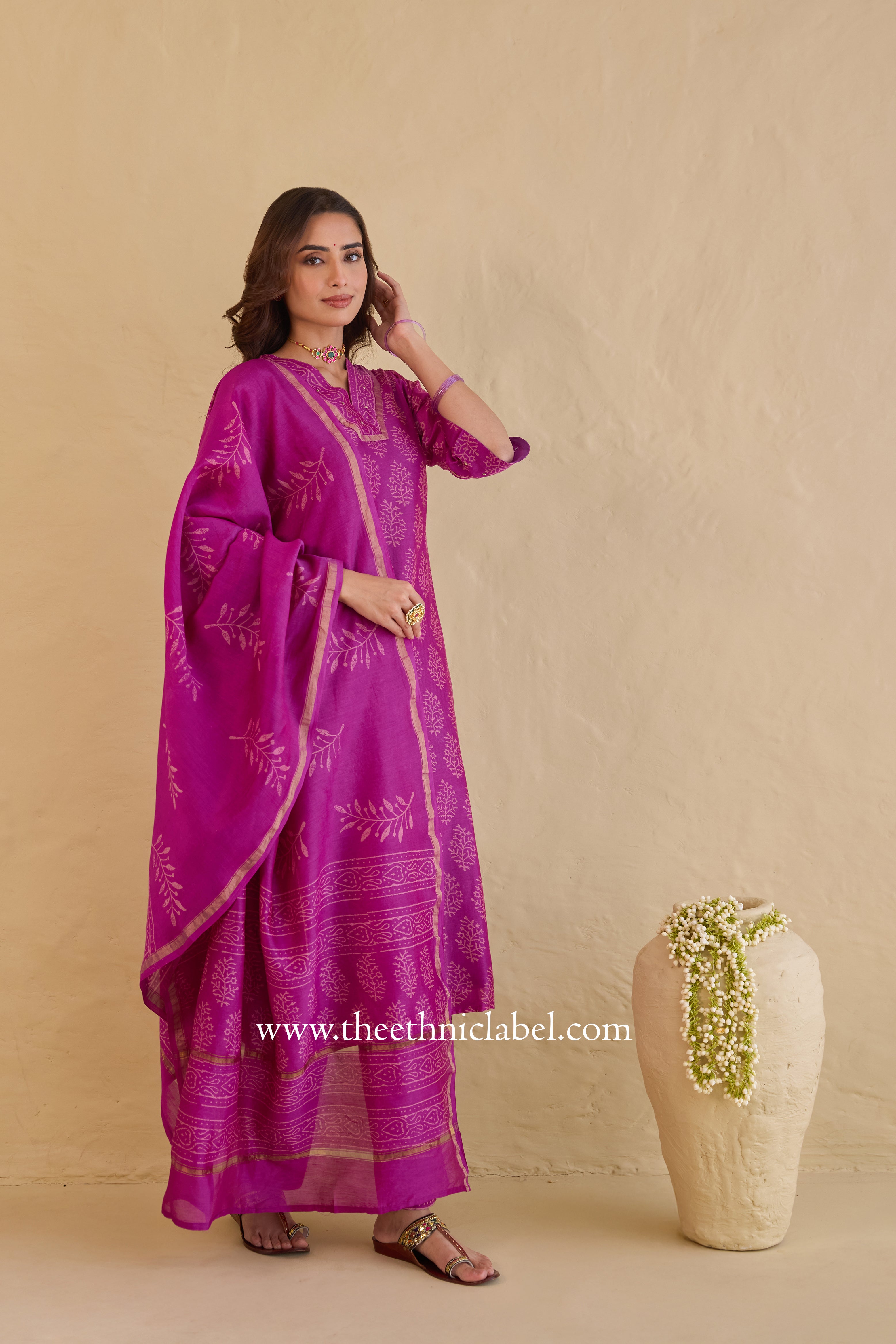 "Tarang" Magenta Hand Block Printed Embroidered Chanderi Suit Set (3pc)