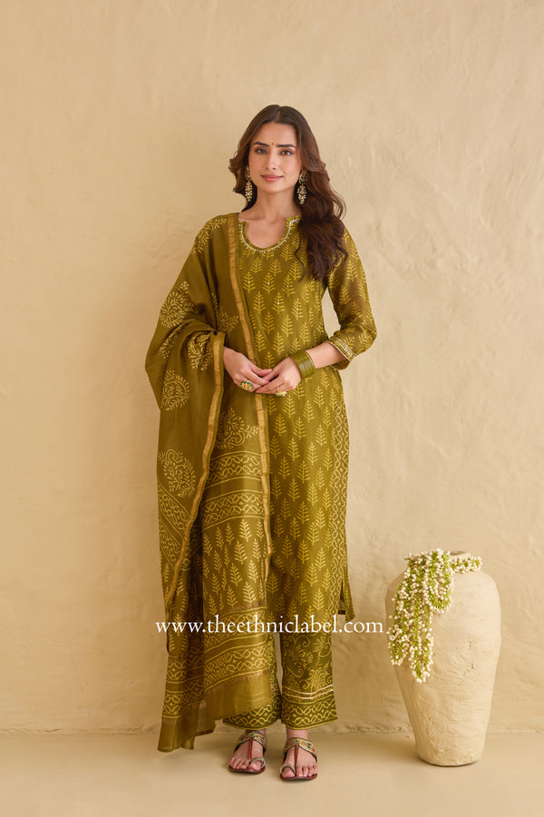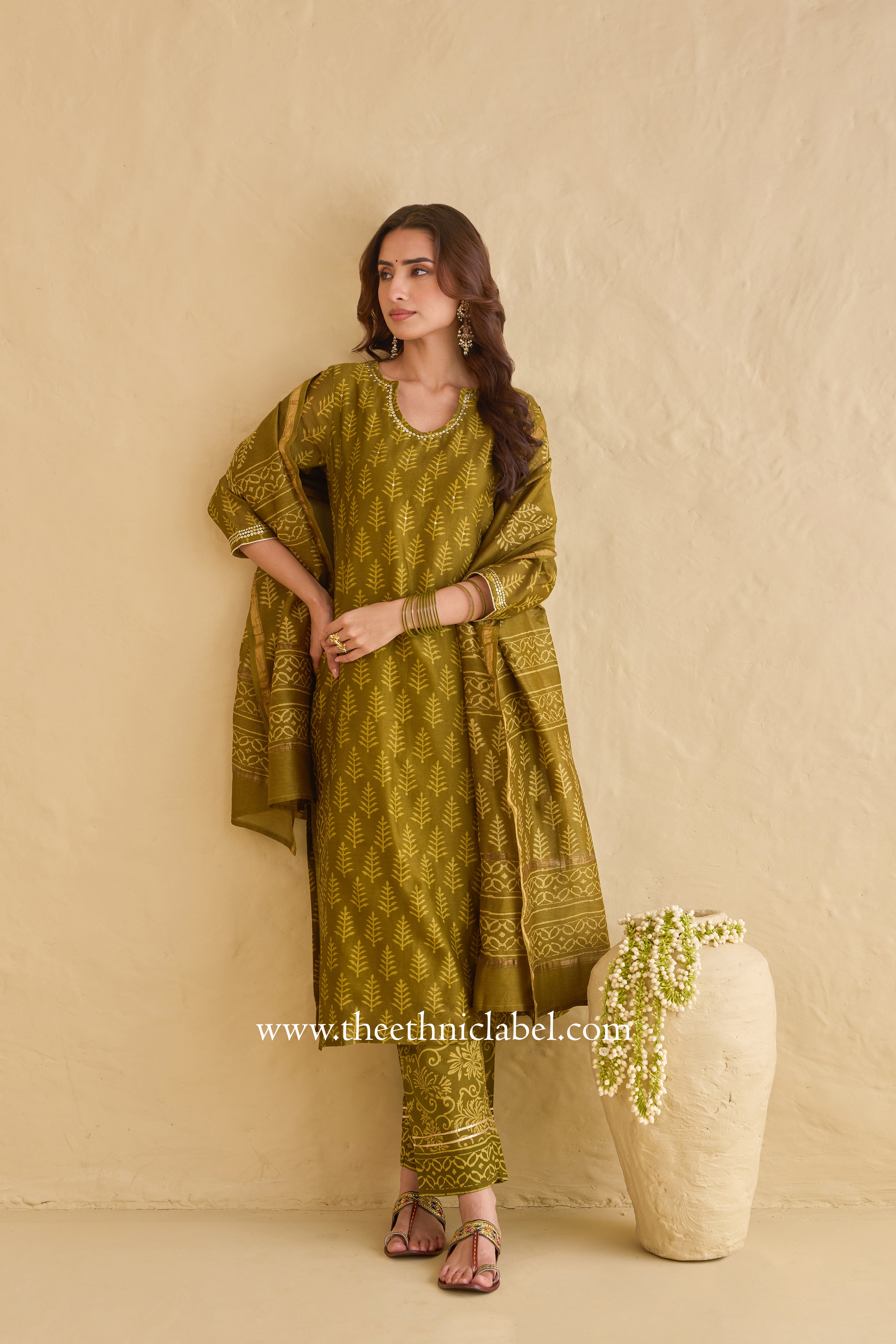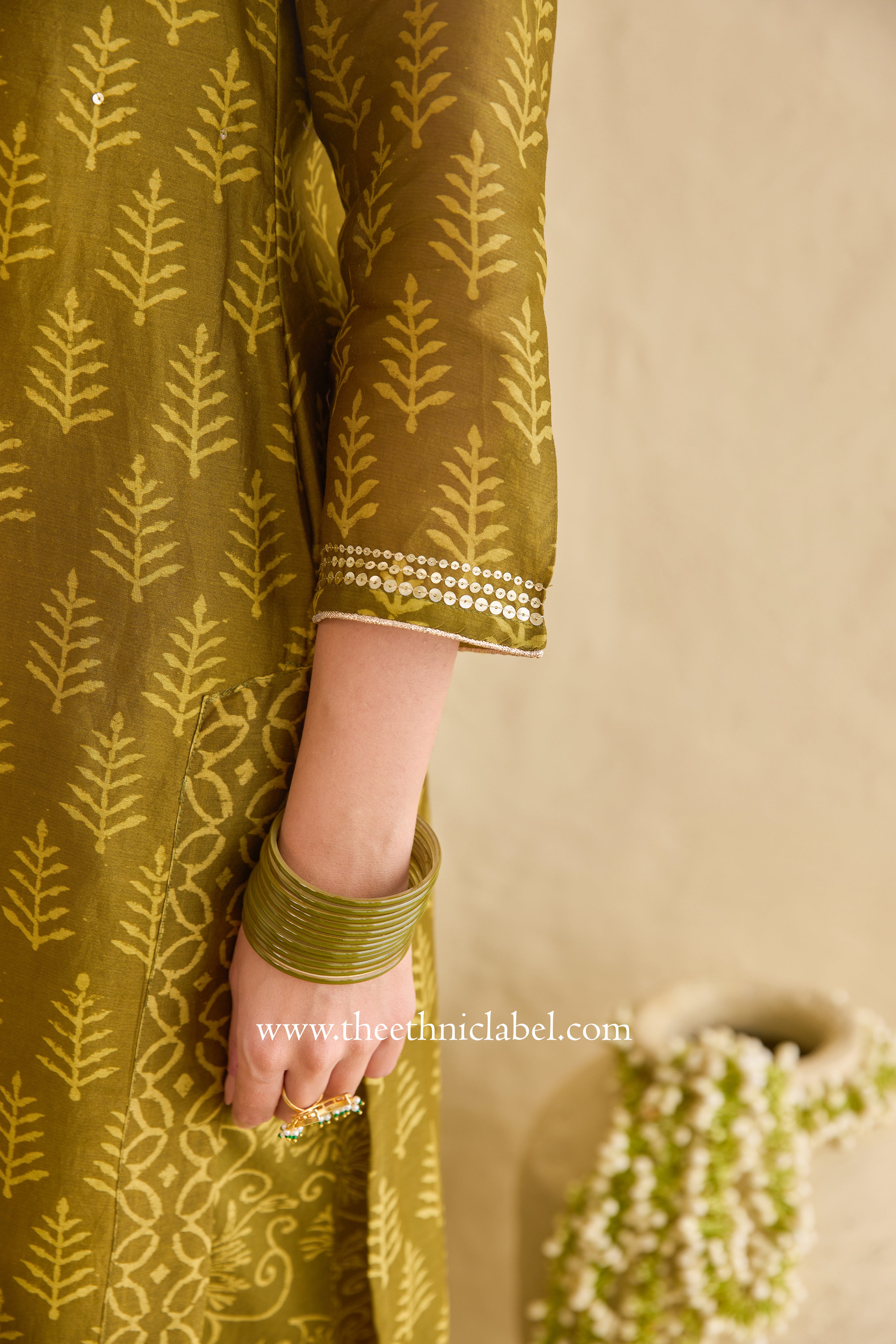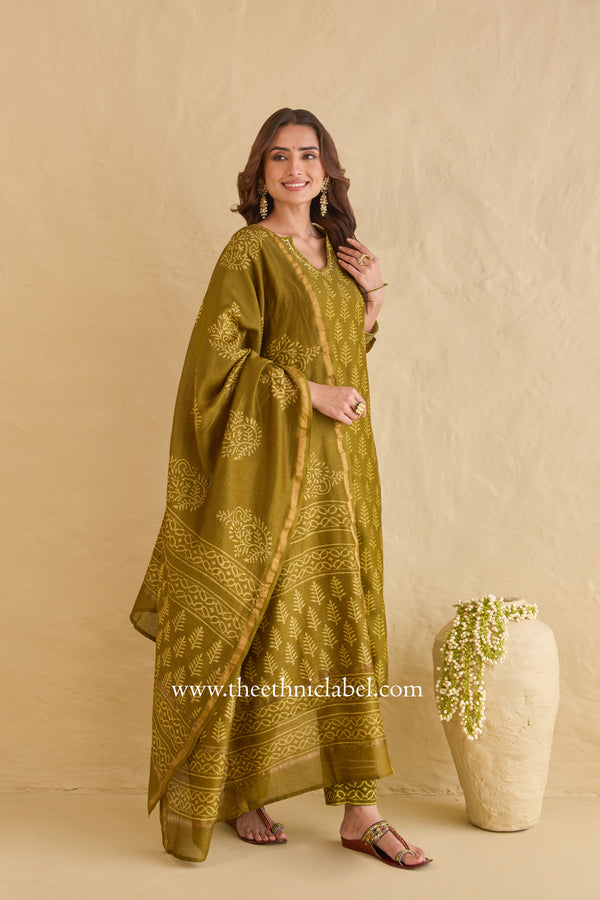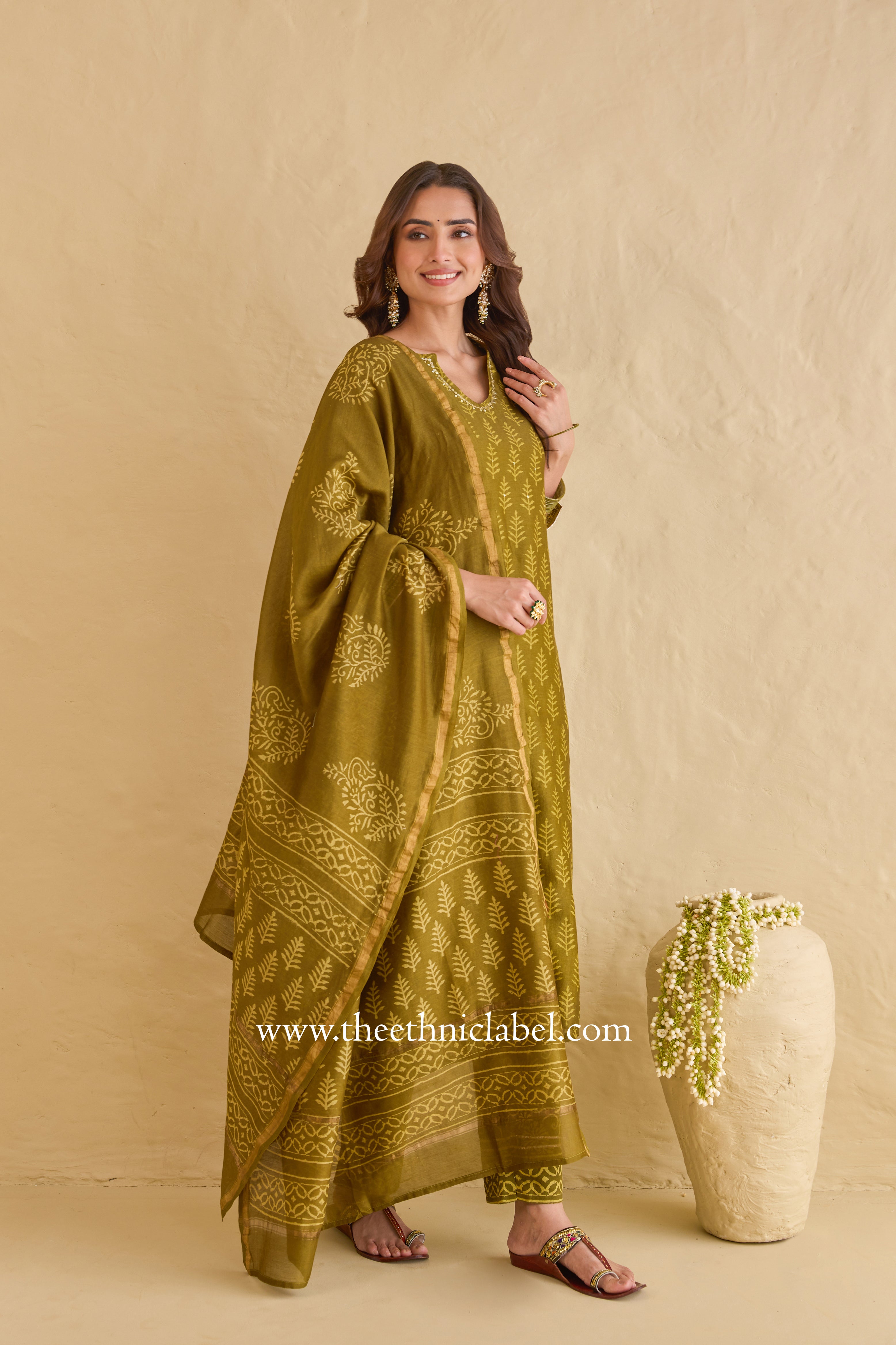 "Parizad" Green Hand Block Printed Hand Work Chanderi Suit Set (3pc)