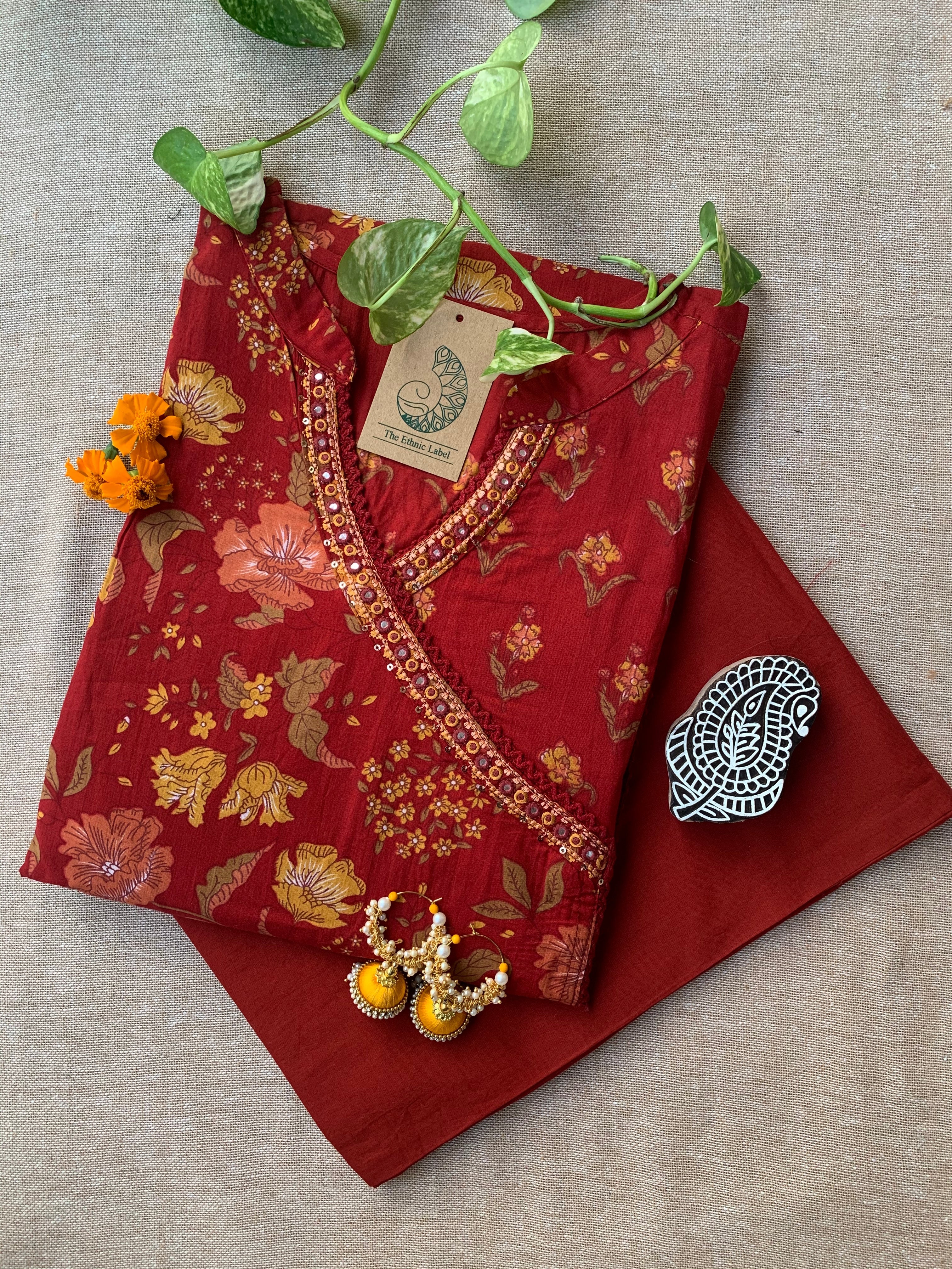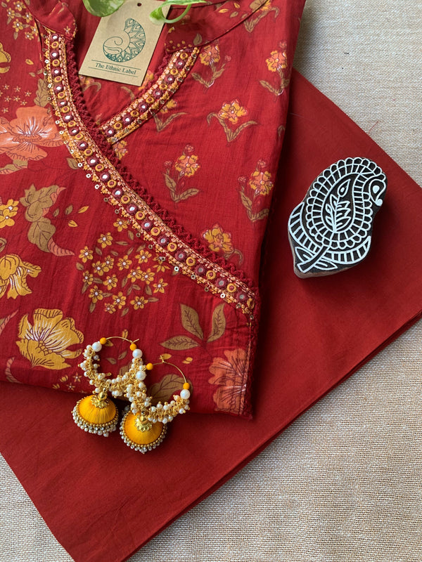 Festive delight, this kurta set is designed for all the days you want to keep things special and festive. This kurta set is a piece of art. The kurta comes with handwork in the neckline and has angrakha pattern in the yolk .The soothing cotton fabric is the show winner. The set contains kurta and pants