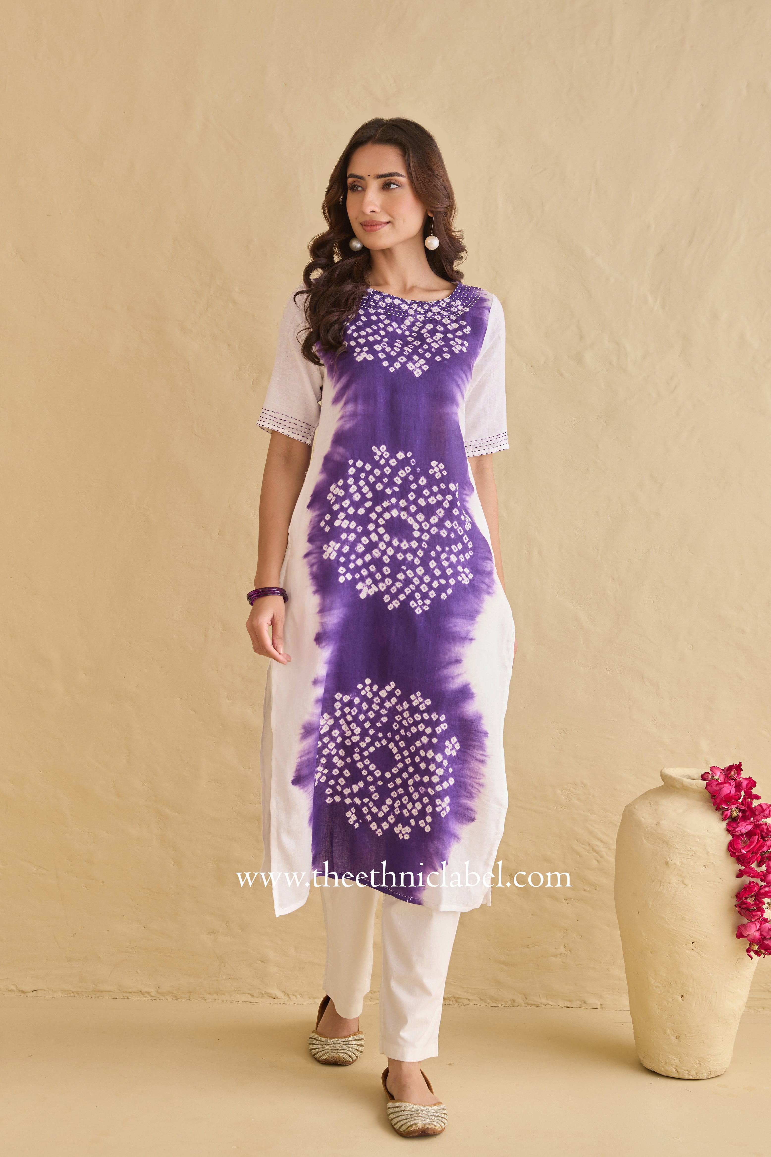 Base Color: White and purple Fabric: Pure Cotton Sleeve: 3/4th Kurta Length: 46" Pocket: Yes CARE: Gentle Hand Wash