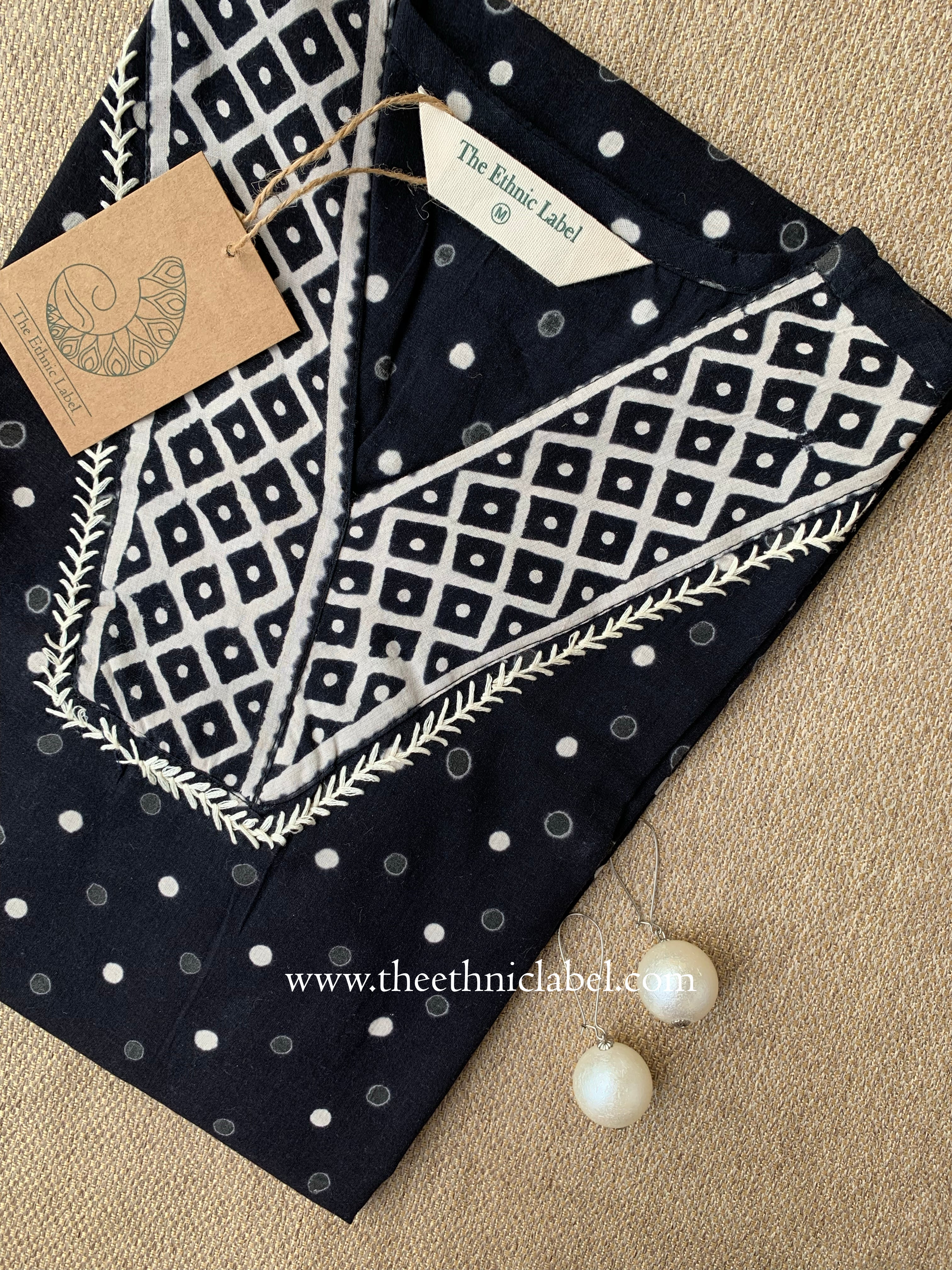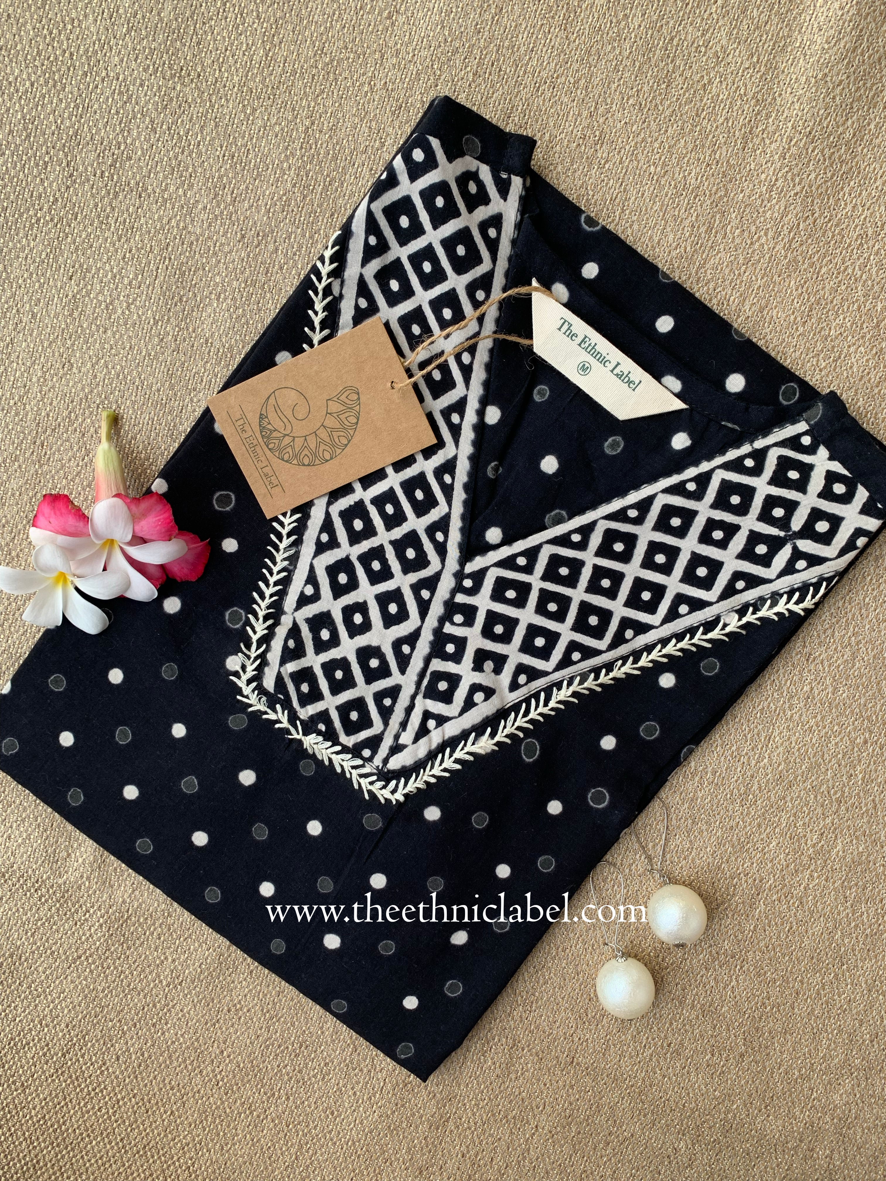 Crafted in pure cotton, our kurtas feature timeless hand block prints inspired by age-old artistry. Each piece carries intricate polka dot pattern stamped by skilled artisans. Comfortable yet elegant, they are perfect for everyday wear with a touch of heritage.This kurta has an embroidered V neck adding to the charm.