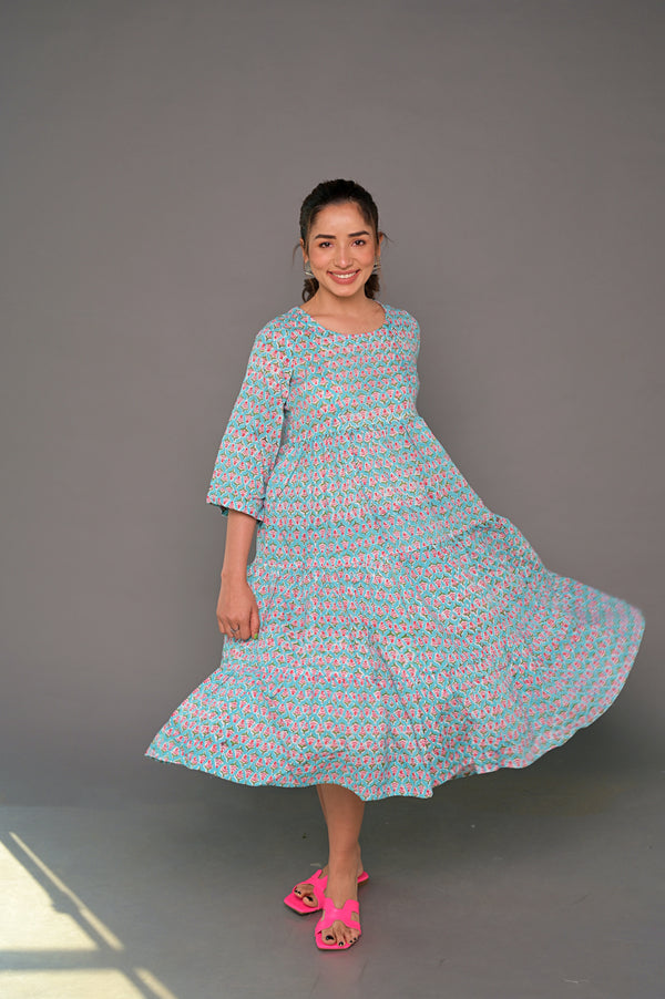 Comfort and Style go hand in Hand. This ensemble with bell sleeves and flared fit is all you need for a quick outing. It has three tiers and has a beautiful Hand Block Printed boota which is subtle yet attractive.