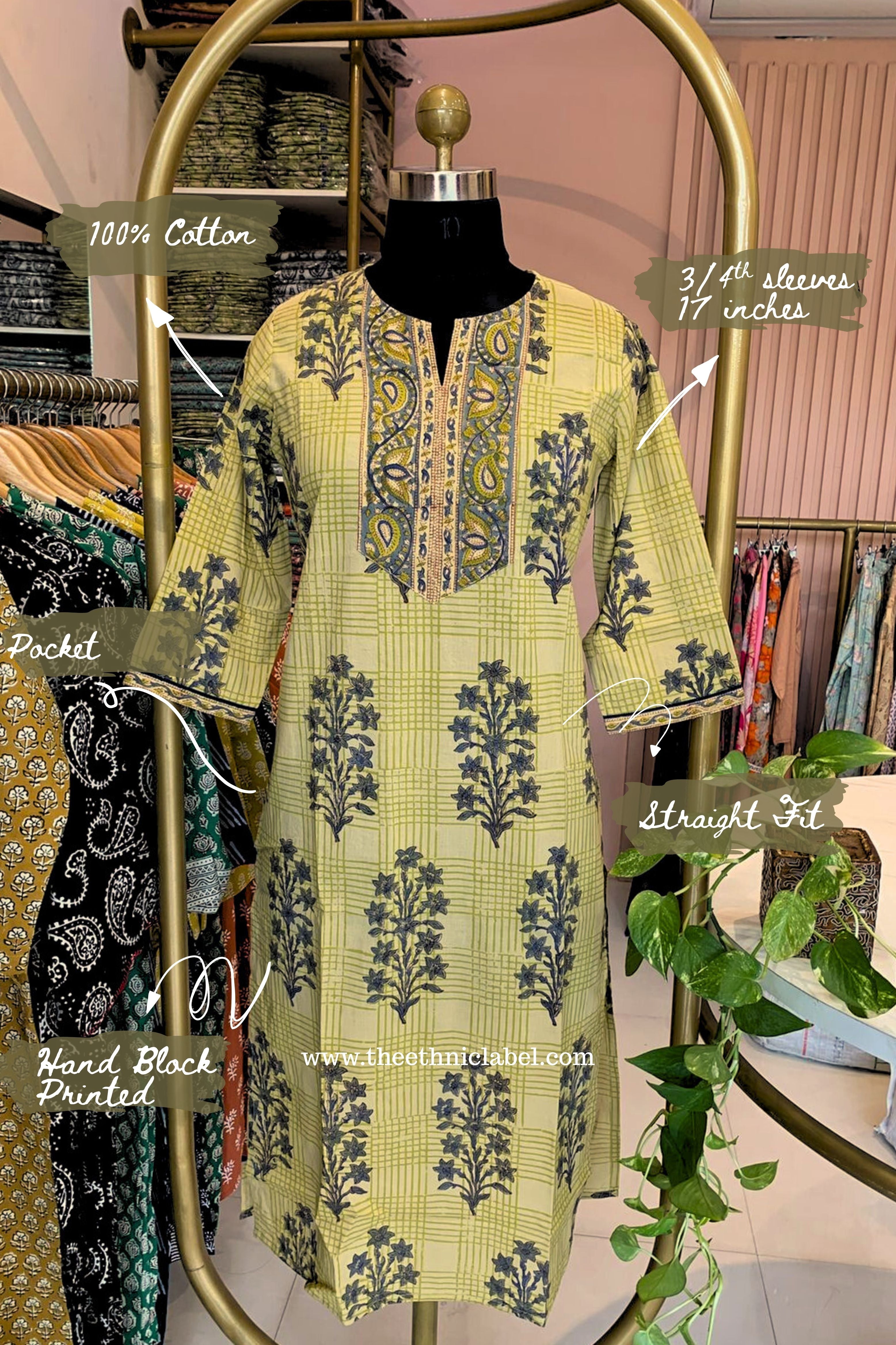 Crafted in pure cotton, our kurtas feature timeless hand block prints inspired by age-old artistry. Each piece carries unique motifs stamped by skilled artisans. Comfortable yet elegant, they are perfect for everyday wear with a touch of heritage.This kurta has a round neckline and a unique pattern at back.