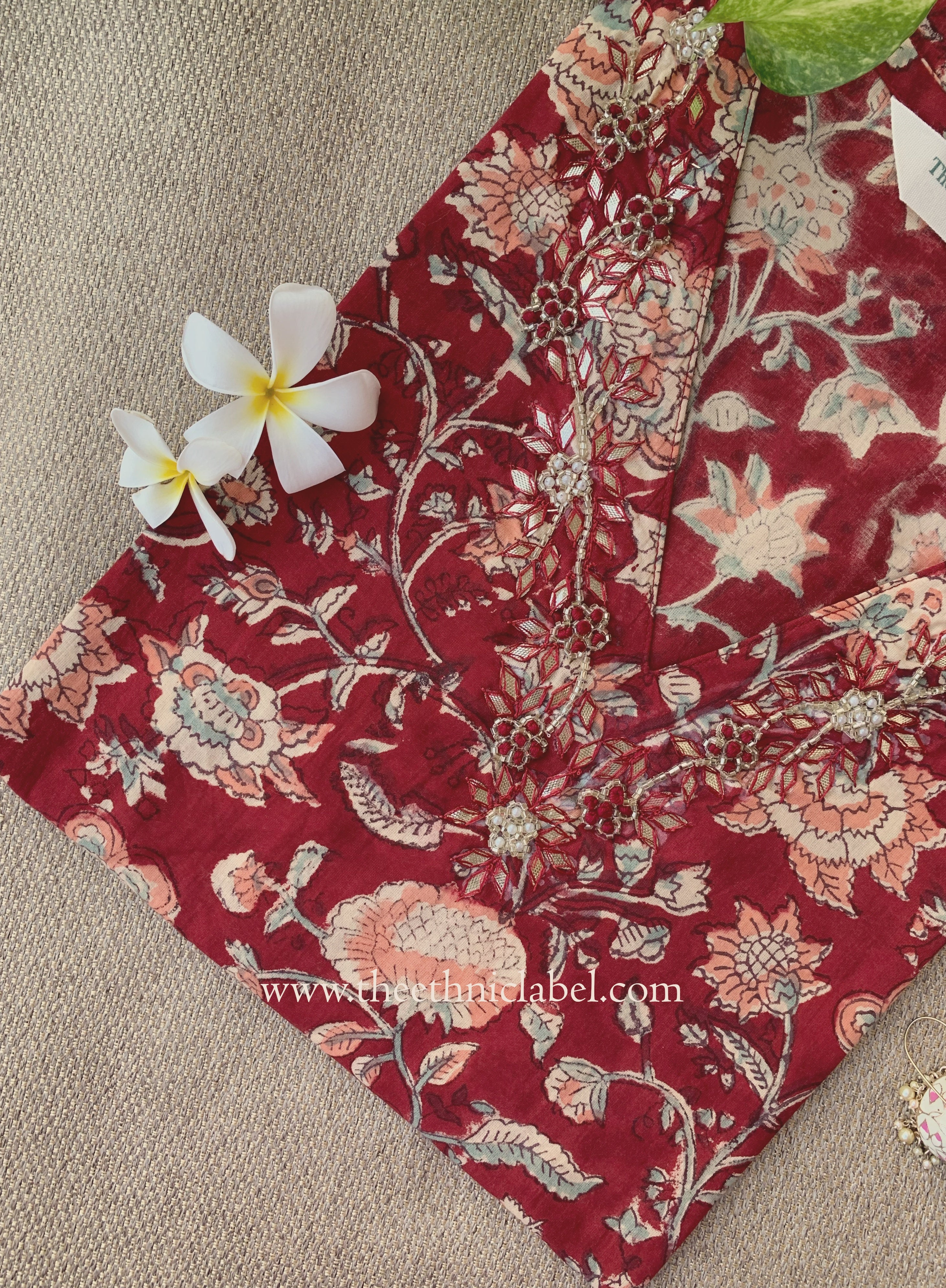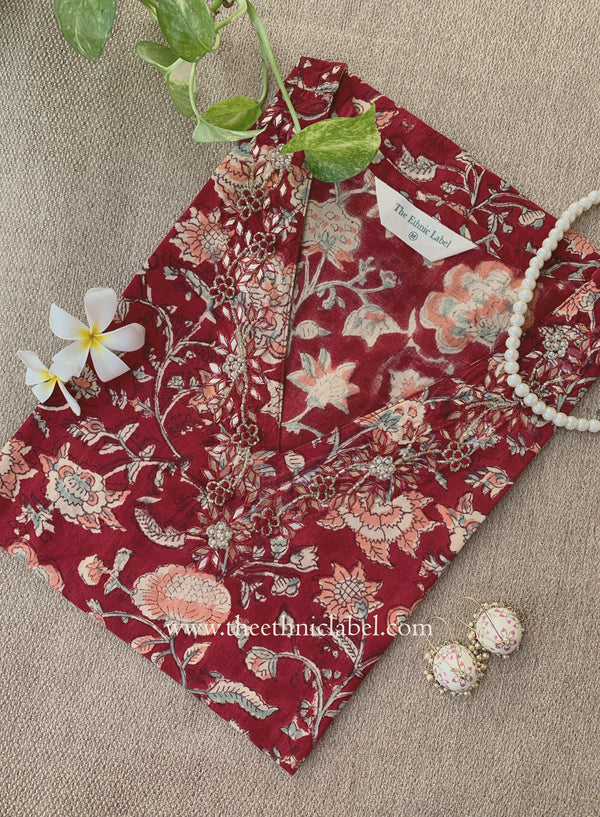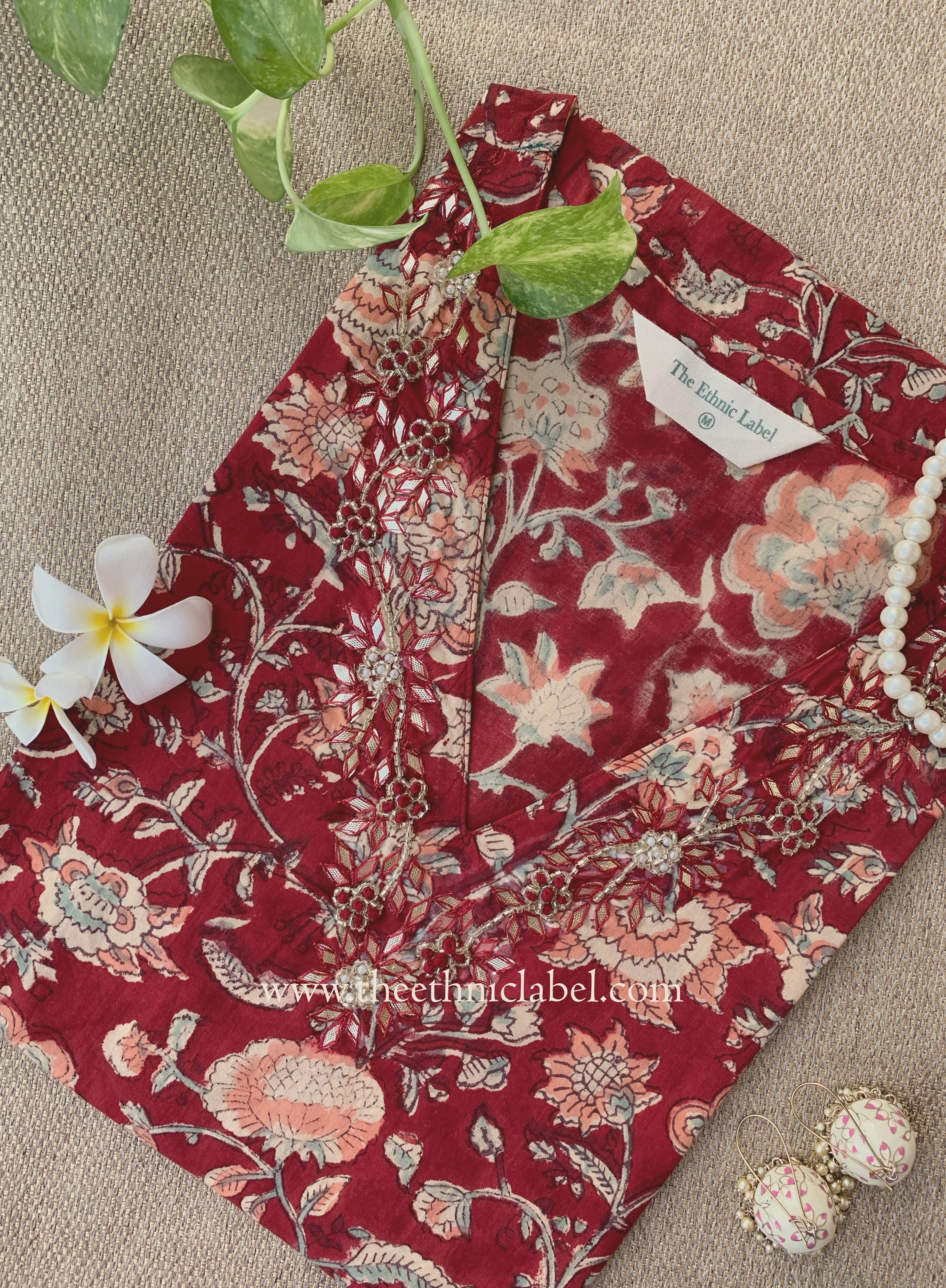 "Naqsh" Hand Embroidered Block Printed Red Cotton kurta