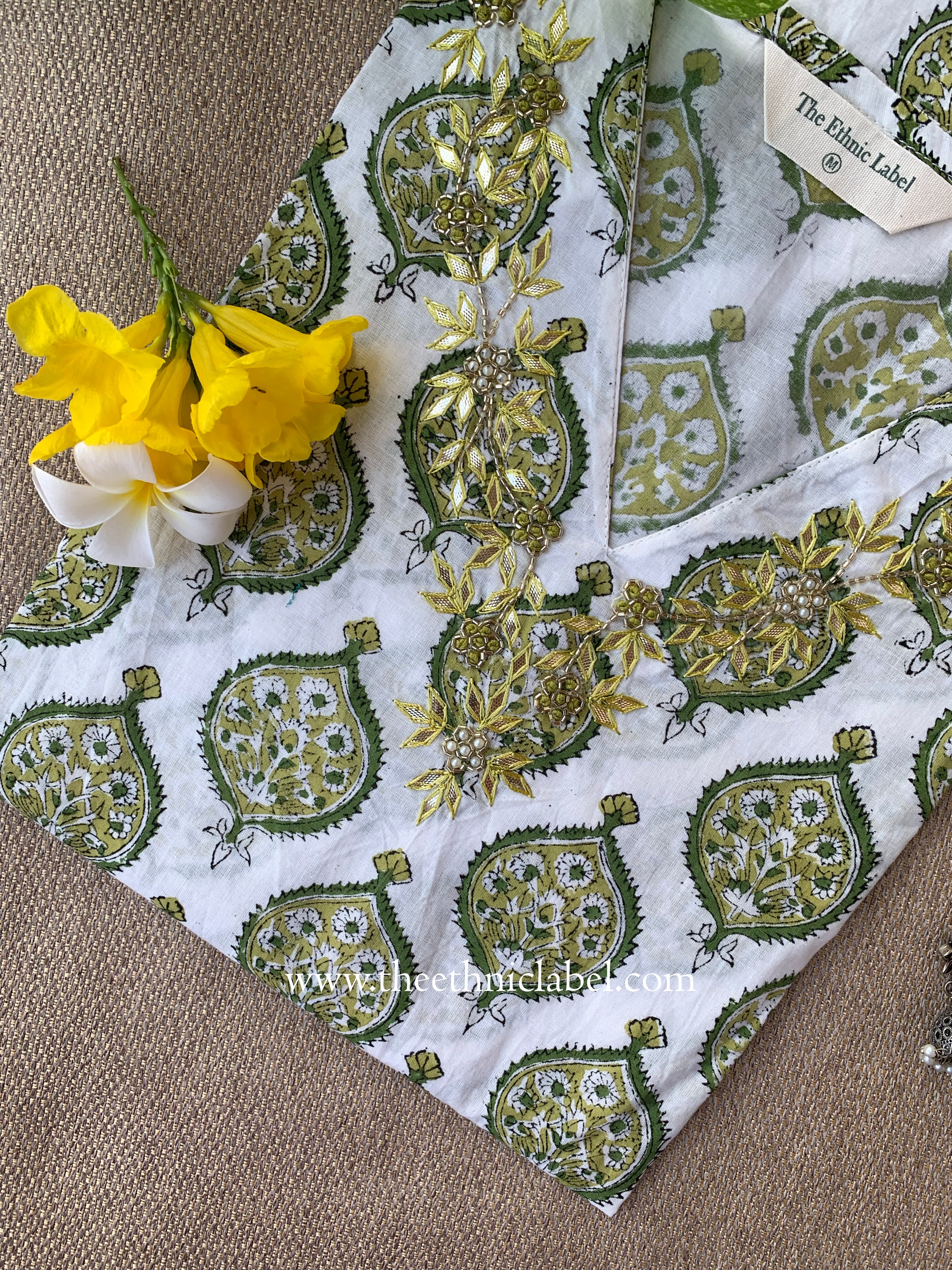 "Tasveer" Hand Embroidered Block Printed White Cotton kurta