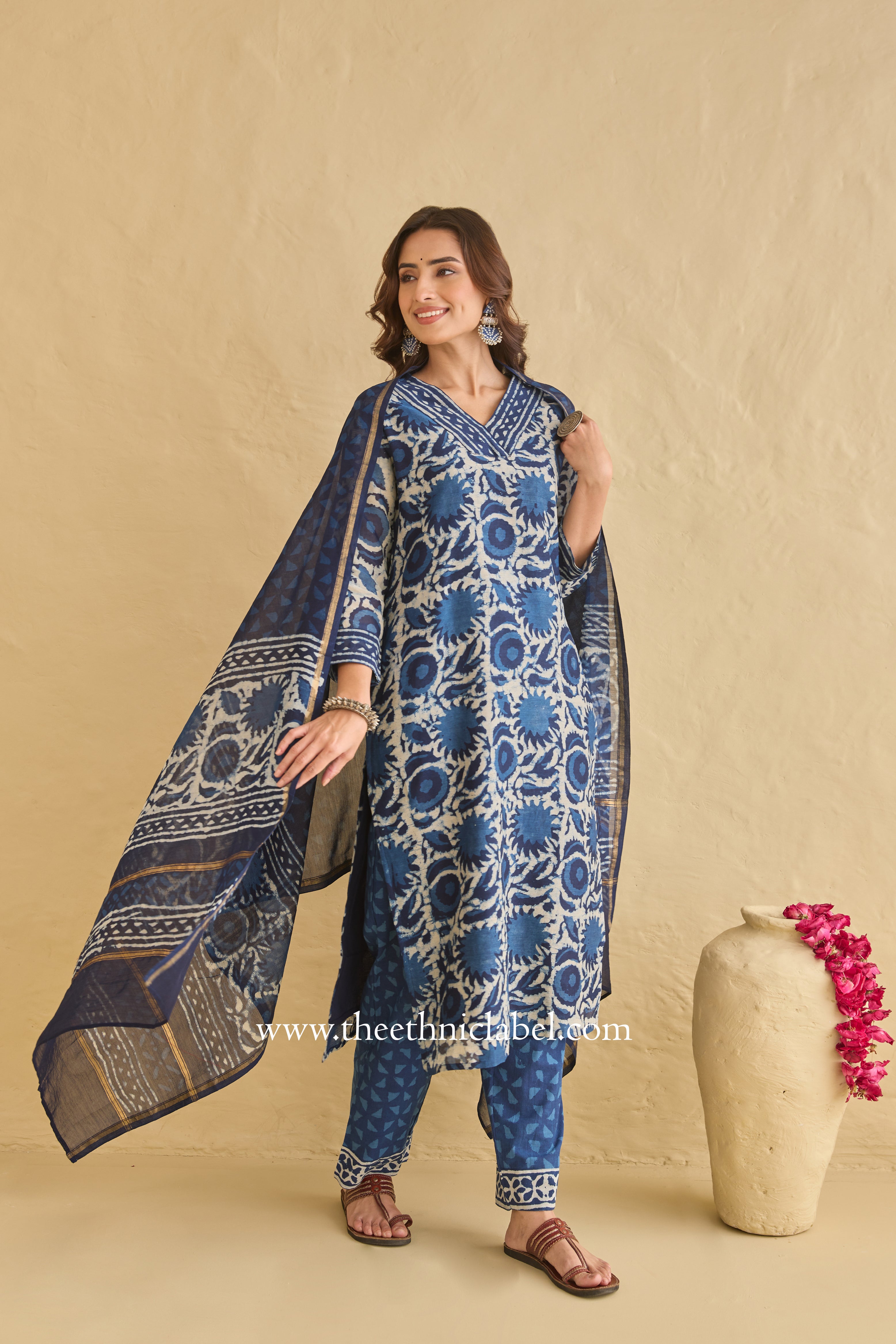 Celebrate your style with this Chanderi Suit Set with Floral Hand Block Printing by the artisans. Its unique combination of traditional craftsmanship and contemporary design will make you stand out at any event, whether it's a wedding, festive celebration, or a special evening out. Embrace the beauty of Indian heritage in this extraordinary ensemble, and radiate timeless charm.Paired with cotton pants and chanderi dupatta, this outifit is surely a head turner.