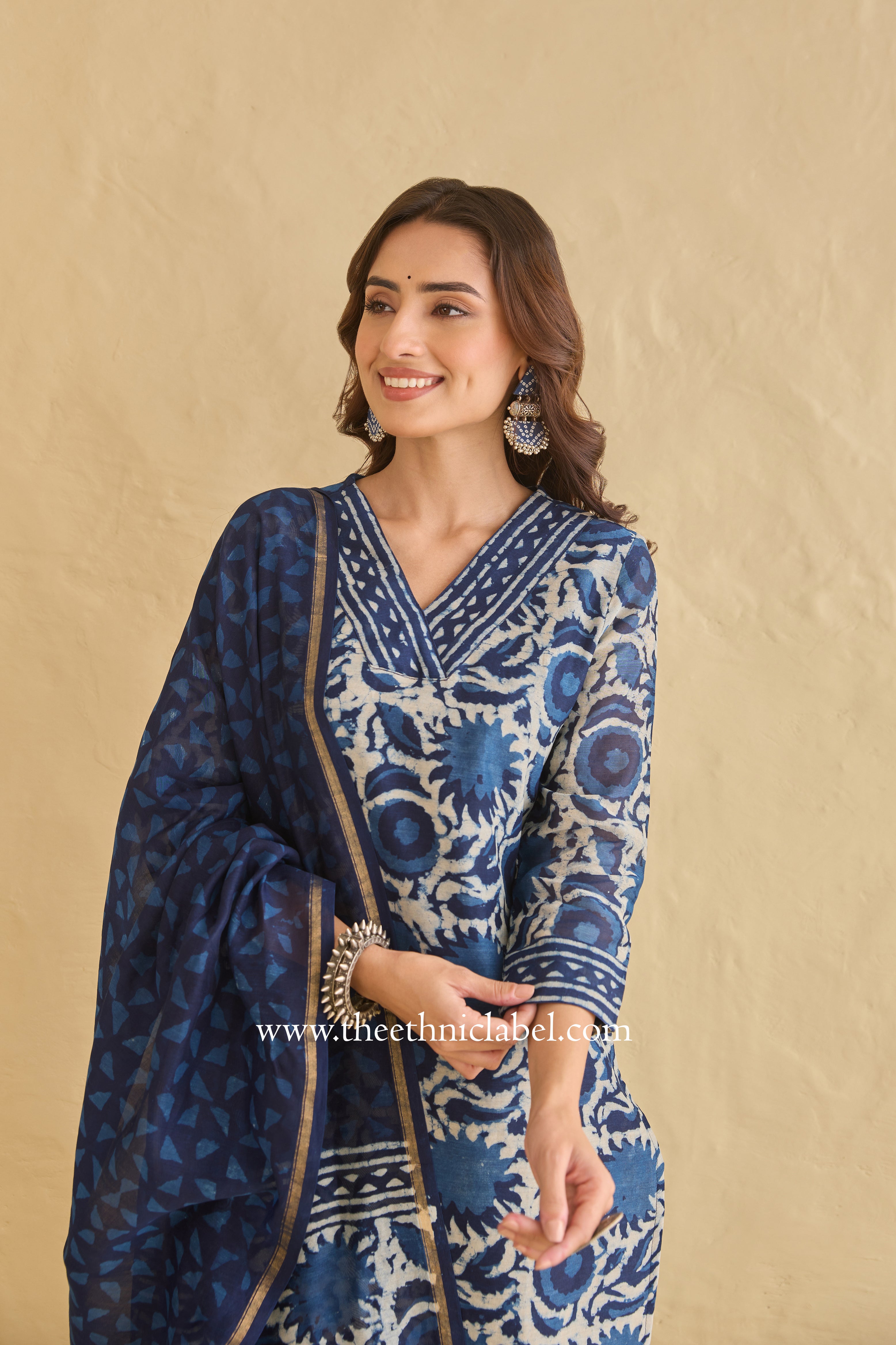 Base Color: Indigo Fabric:Kurta: Chanderi, Pant:Cotton, Dupatta: Chanderi Sleeve: 3/4th Kurta Length: 46" Lining: Yes CARE:Dry Clean only